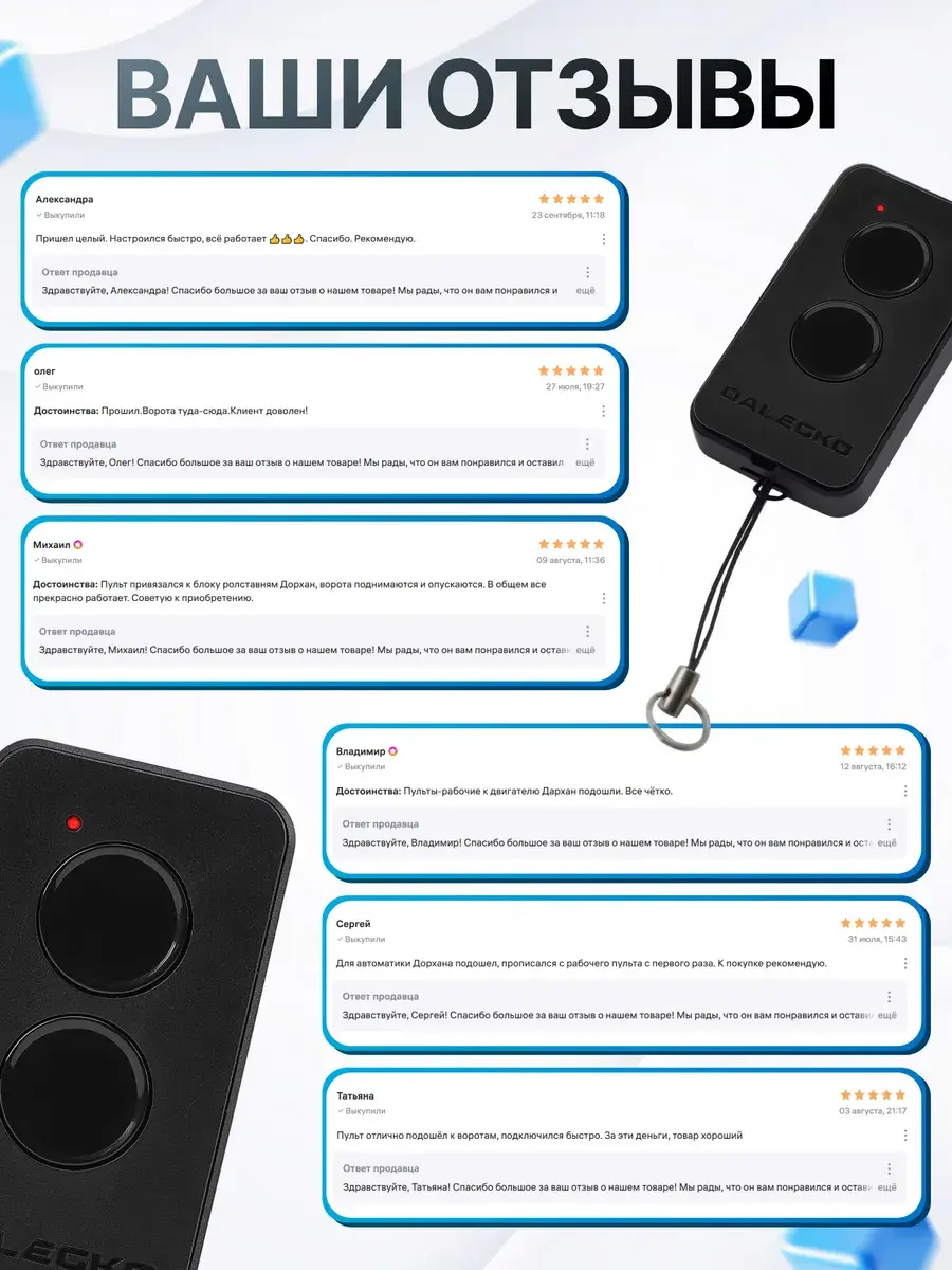 Отличный пульт, компактный, без проблем прописался к воротам Дорхан. Рекомендую!