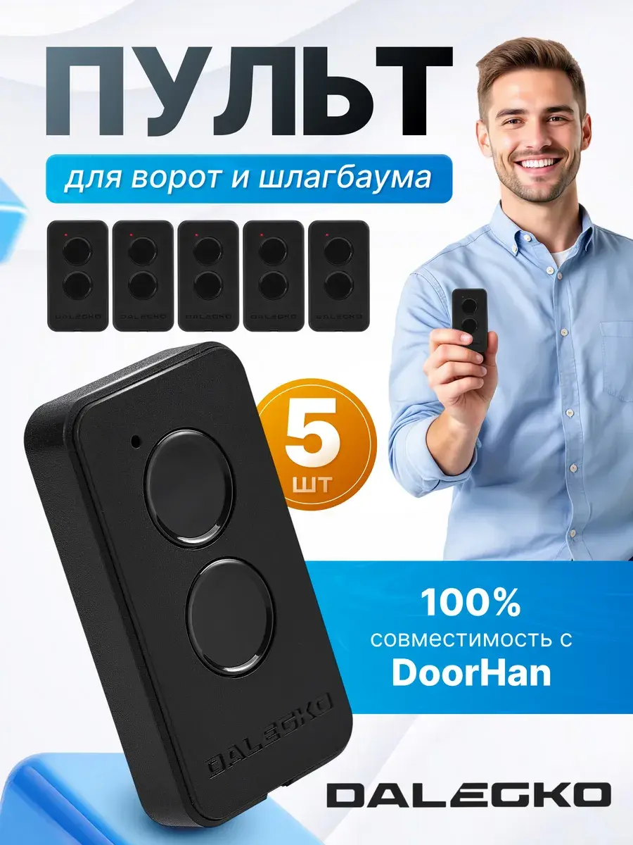 Умный пульт для ворот и шлагбаумов от Dalegko - идеальное решение для автоматизации процесса управления. Совместим с системами автоматики doorhan (дорхан). Наш оригинальный пульт работает на частоте 433 МГц и обеспечивает надежное беспроводное управление воротами и шлагбаумами с помощью дистанционного управления. Имеет два независимых рабочих канала. Пульт работает на расстоянии не менее 50м, с диапазоном рабочих температур от -20/+55С. Умный пульт позволяет управлять воротами и шлагбаумом прямо из дома, что делает вашу жизнь более удобной и безопасной. Компактный пульт удобно хранить и использовать в повседневной жизни. Инструкция по программированию идет в комплекте. Не требует сложной установки и настройки - просто подключите и начинайте пользоваться, батарейка уже внутри.
